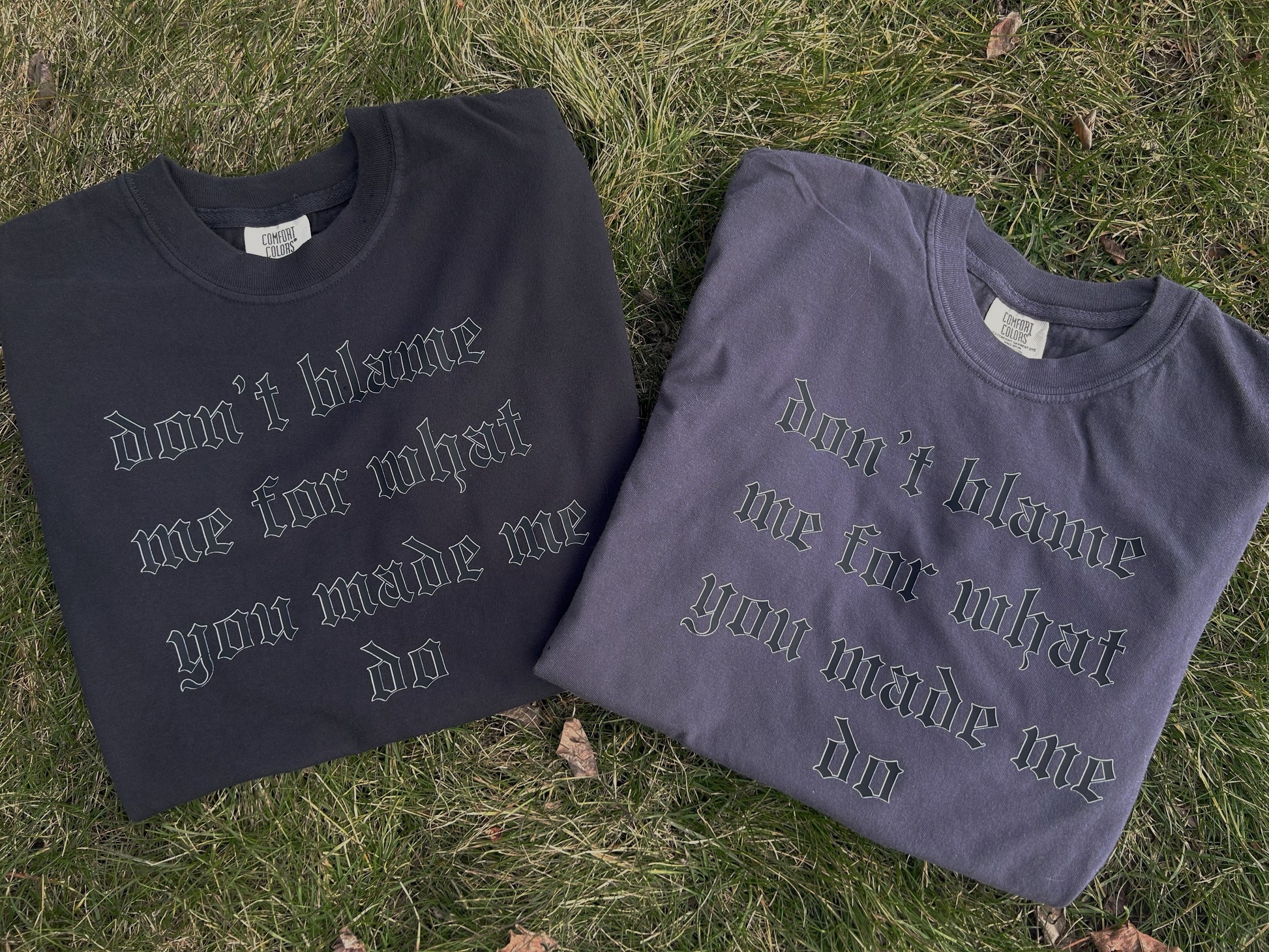 Two of the most iconic lyrics of Reputation, pressed onto a soft tee! Available in charcoal and black. Tees are unisex and the design lays in the center of the shirt.